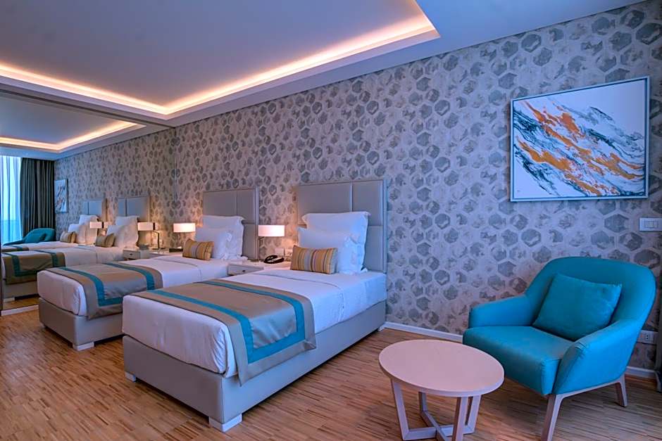 Indulge in the ultimate coastal retreat with our Premium Bay Room, a haven of elegance and spaciousness at 43 square yards. Enjoy the modern interior of shiny hardwood flooring and bespoke furnishings that exude contemporary style. Immerse yourself in the tranquil ambiance created by the soothing blue and white decor. Choose between a luxurious king bed or versatile twin beds, tailored to your needs. Revel in uninterrupted full panoramic sea views from your private balcony, complete with inviting outdoor seating perfect for savoring the scenery. Refresh in style with a modern walk-in shower. With a stylish indoor seating area, top-tier 5-star amenities, and a coffee machine, every detail is designed to elevate your comfort and sophistication.